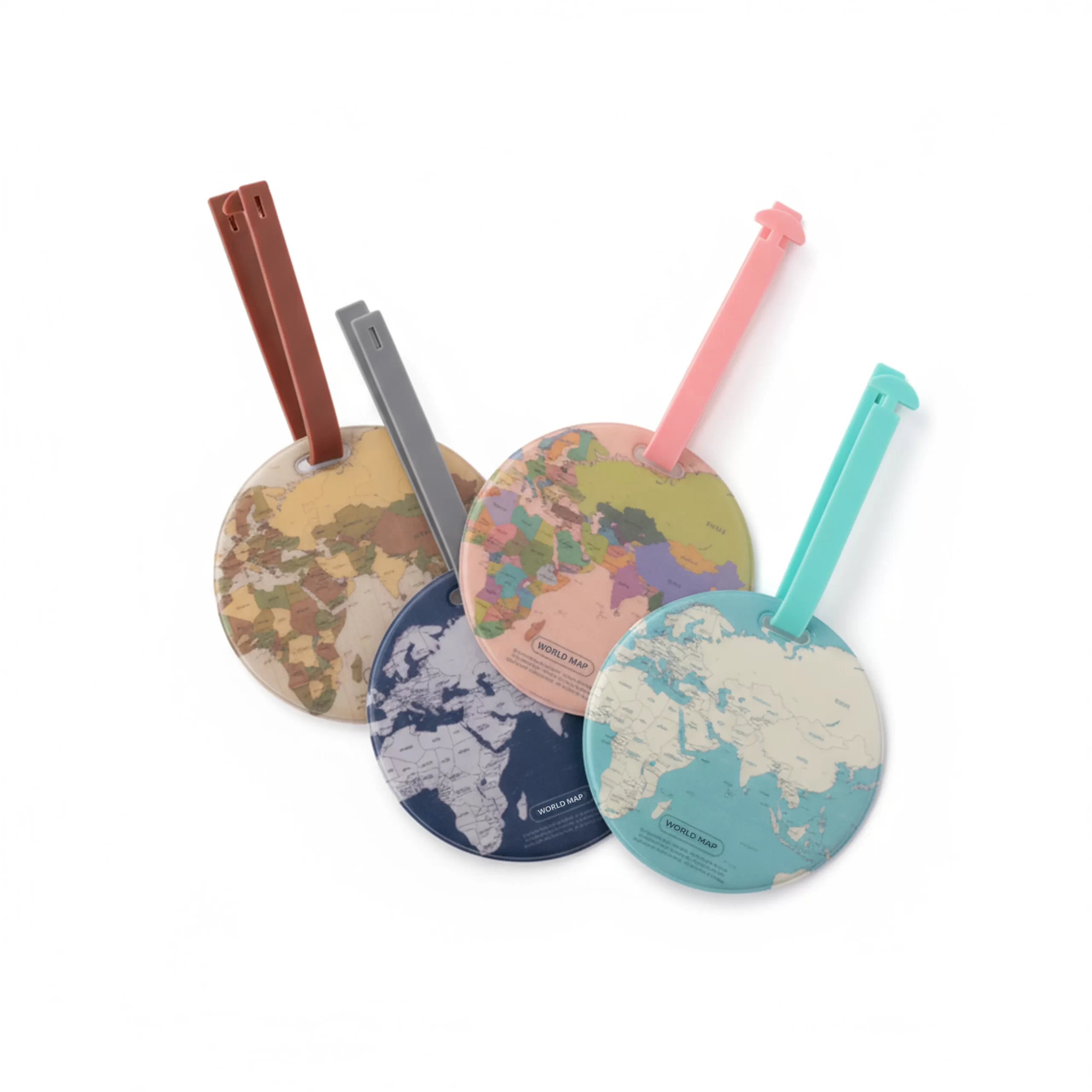 بطاقات تعريف الحقائب بتصميم خريطة العالم  مكونة من أربع بطاقات بألوان وتصاميم مختلفة مستوحاة من خرائط العالم، لتساعدك في تمييز حقائبك بسهولة أثناء السفر