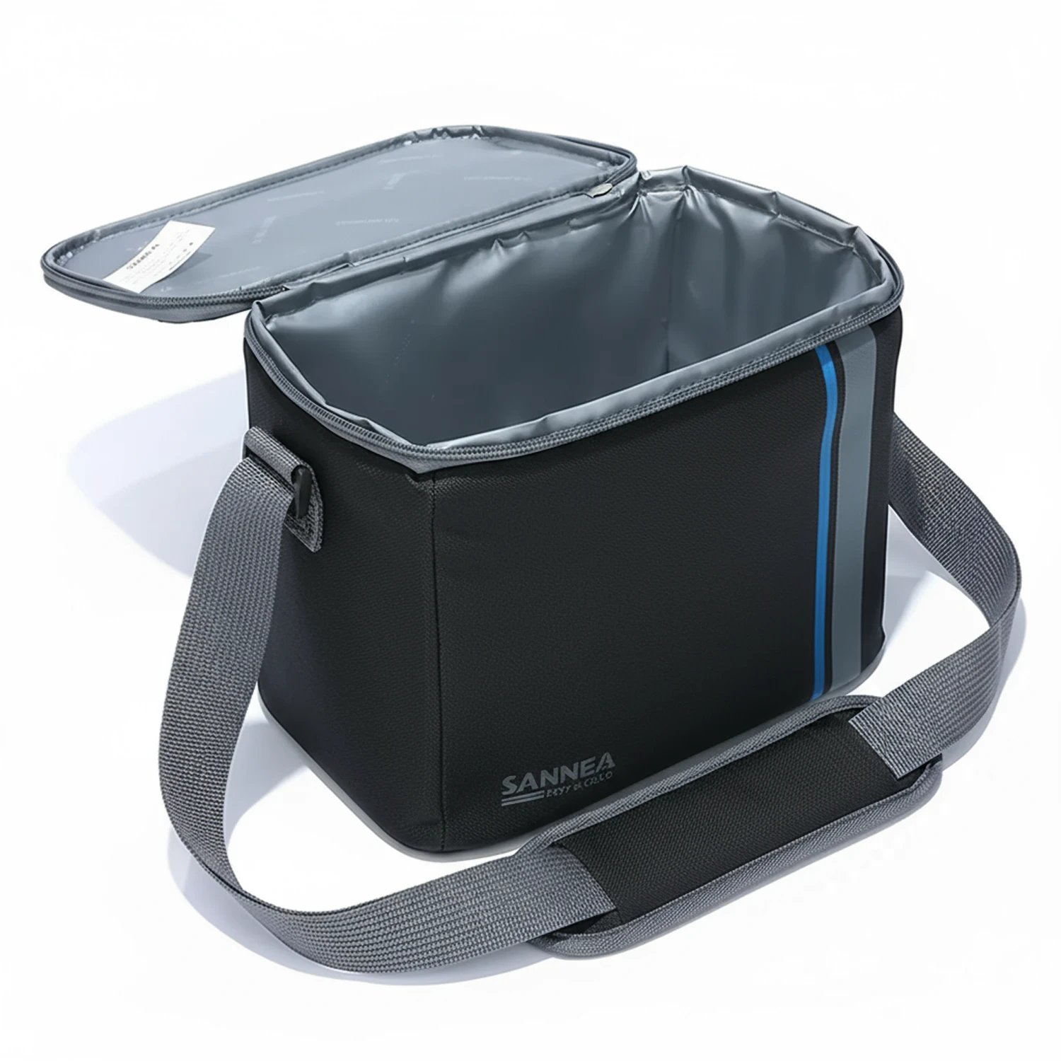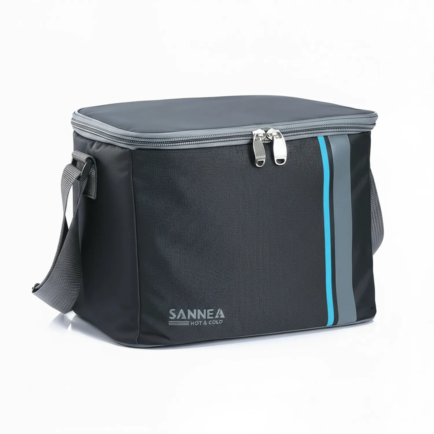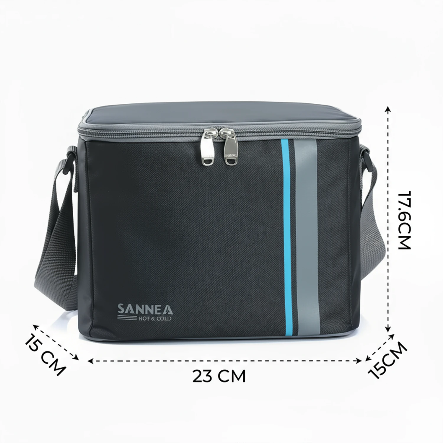 حقيبة أنيقة بلون أسود مع خط ازرق، تحافظ على حرارة أو برودة الأطعمة والمشروبات .