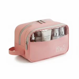حقيبة مستلزمات التجميل لون وردي مع واجهة شفافة