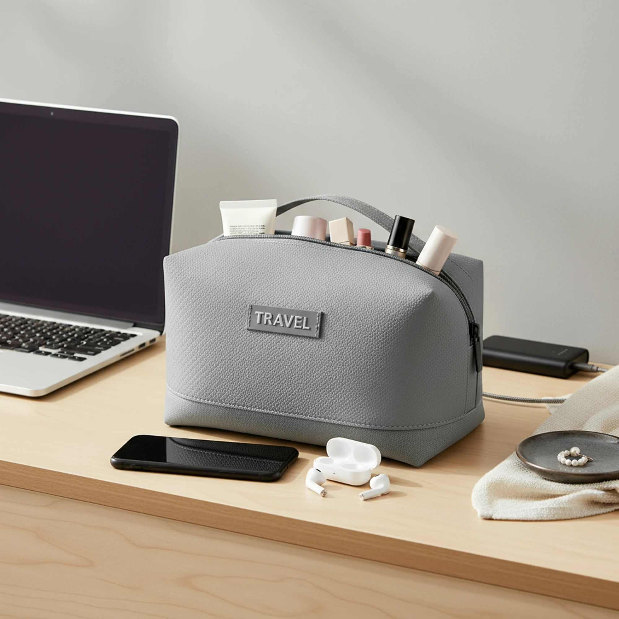 حقيبة أنيقة وعملية تحتوي على أقسام متعددة لتخزين الشواحن والكابلات والباوربانك ومنتجات العناية الشخصية، مما يساعدك على الحفاظ على ترتيب أغراضك وسهولة الوصول إليها