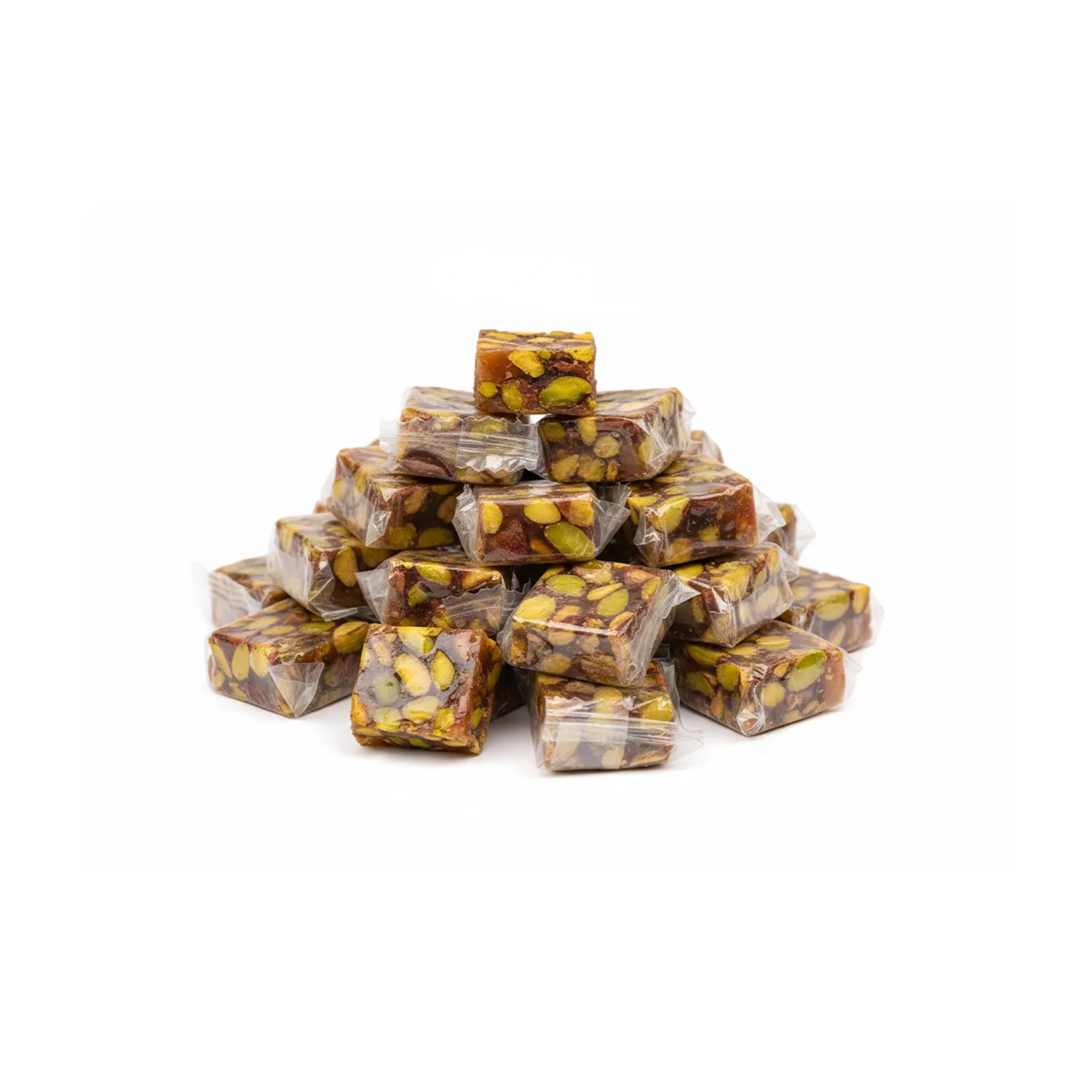 قطع حلقوم ميني مربعة مغطاة بغلاف شفاف، تحتوي على كمية كبيرة من حبات الفستق الممزوجة ليعطيها قواما طريا مما يجعلها مثالية للتقديم والضيافة أو كوجبة خفيفة لذيذة في أي وقت.