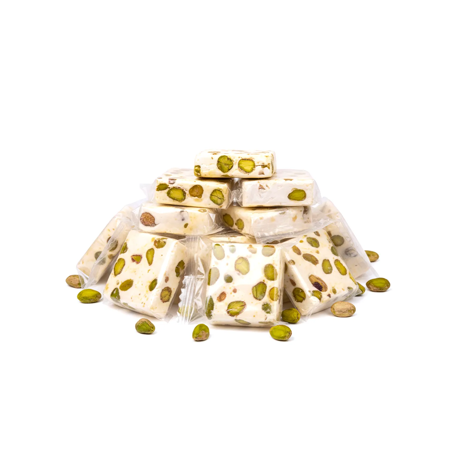 قطع مربعة من النوجا البيضاء المحشوة  بحبات الفستق لتمنحك توازنا لا يقاوم بين النعومة والقرمشة.لتكون خيارك المثالي للضيافة، الهدايا، أو لقمة تدلل فيها نفسك.