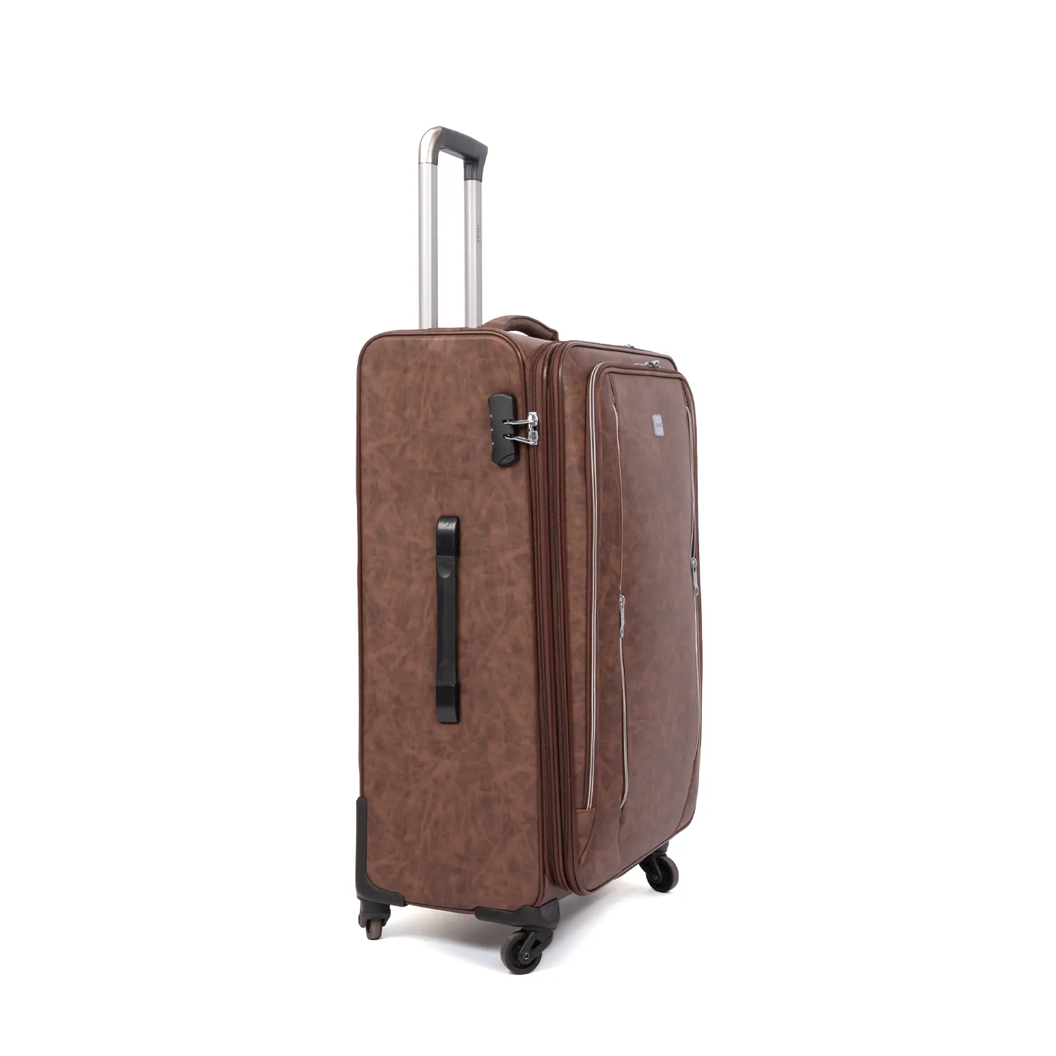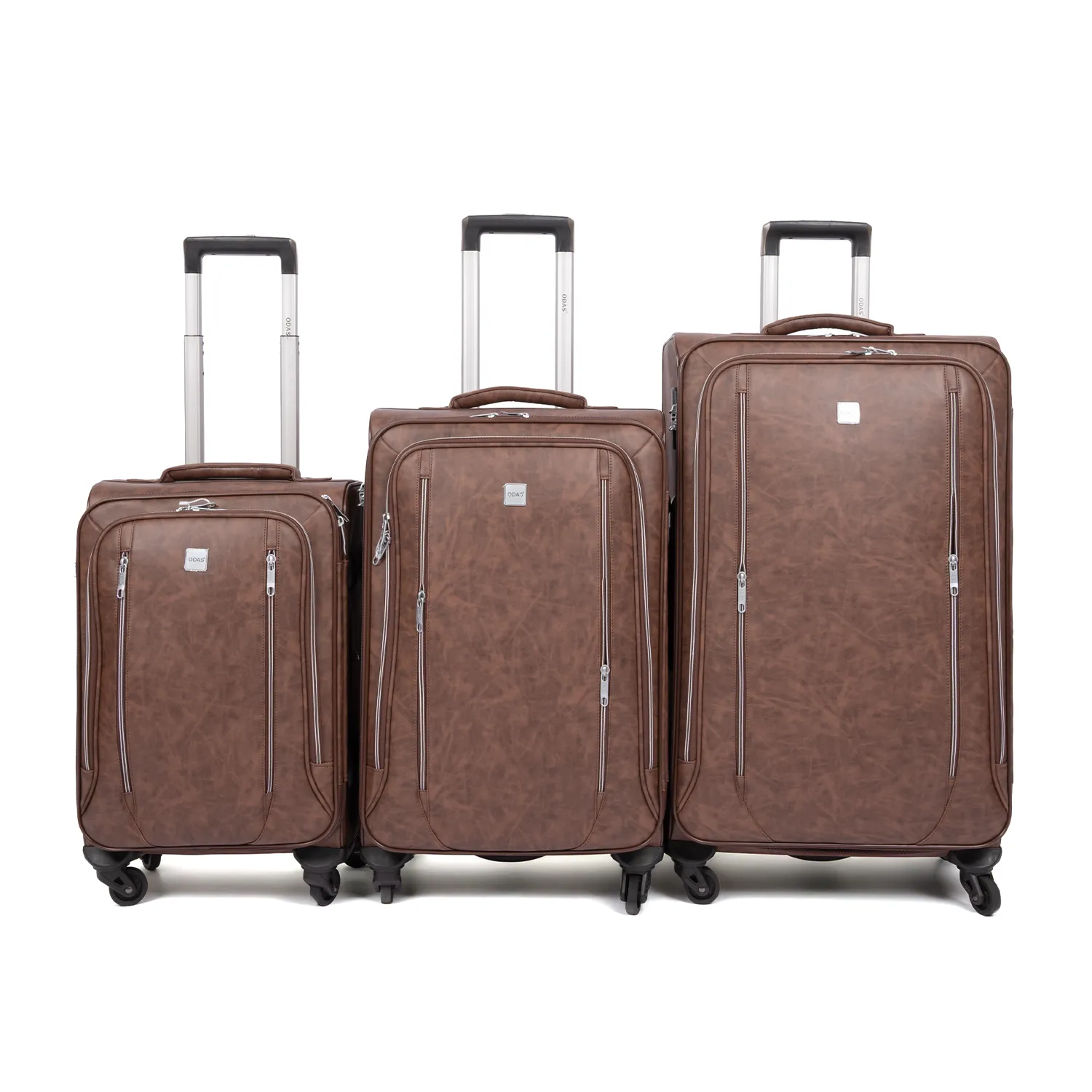طقم حقائب سفر 3قطع بمقاسات (28إنش-24إنش-20إنش)بعجلات دوارة 360 درجة، مصنوع من خامة جلد باللون البني ألانيق، يحتوي كل حجم على جيوب أمامية بسحابات لتسهيل الوصول إلى الأغراض السريعة