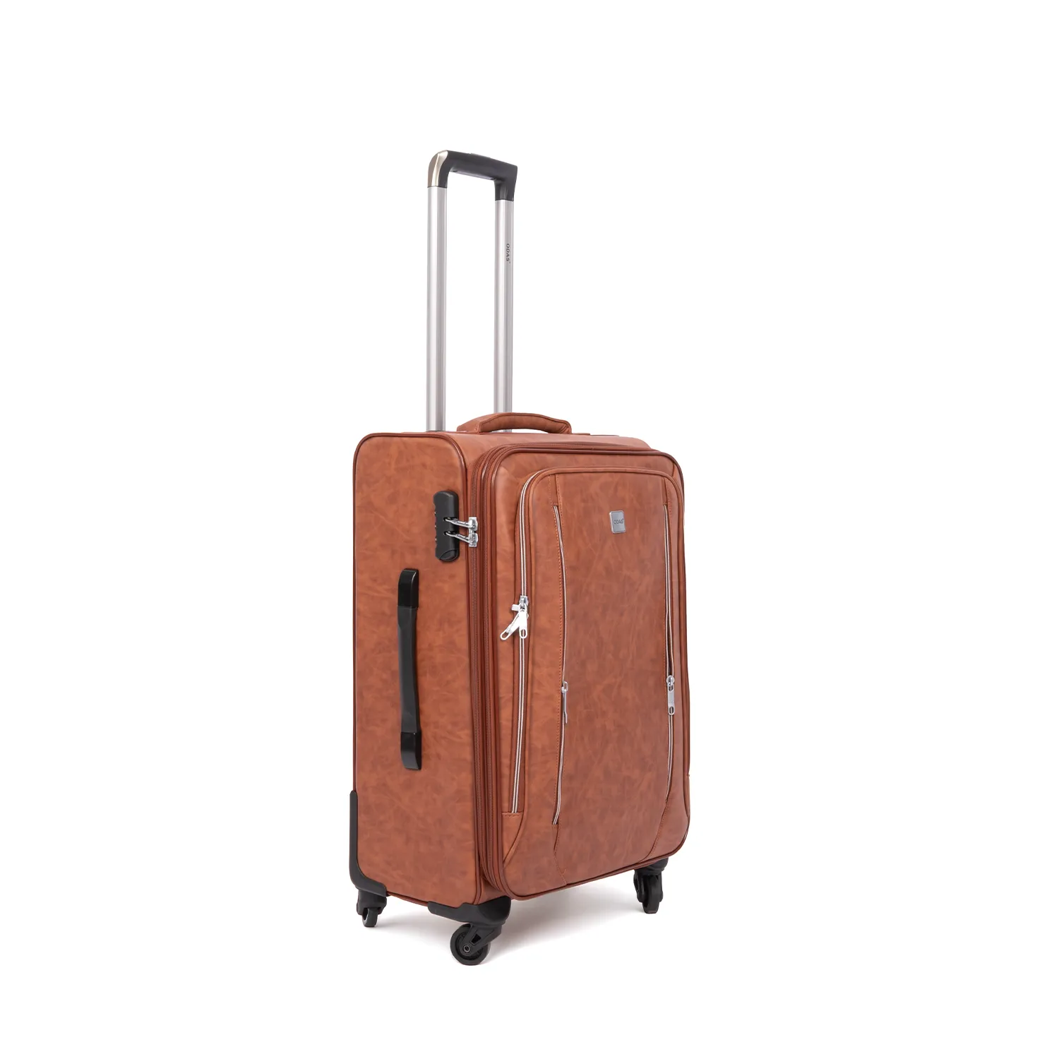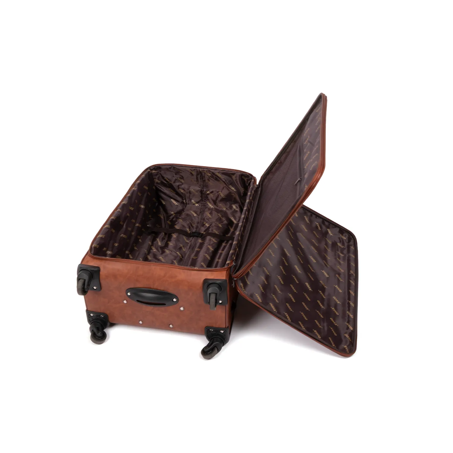 طقم حقائب سفر 3قطع بمقاس(28إنش-24إنش-20إنش) بعجلات دوارة 360 درجة، مصنوع من خامة جلد بلون بني أنيق، يحتوي كل حجم على جيوب أمامية بسحابات لتسهيل الوصول إلى الأغراض السريعة