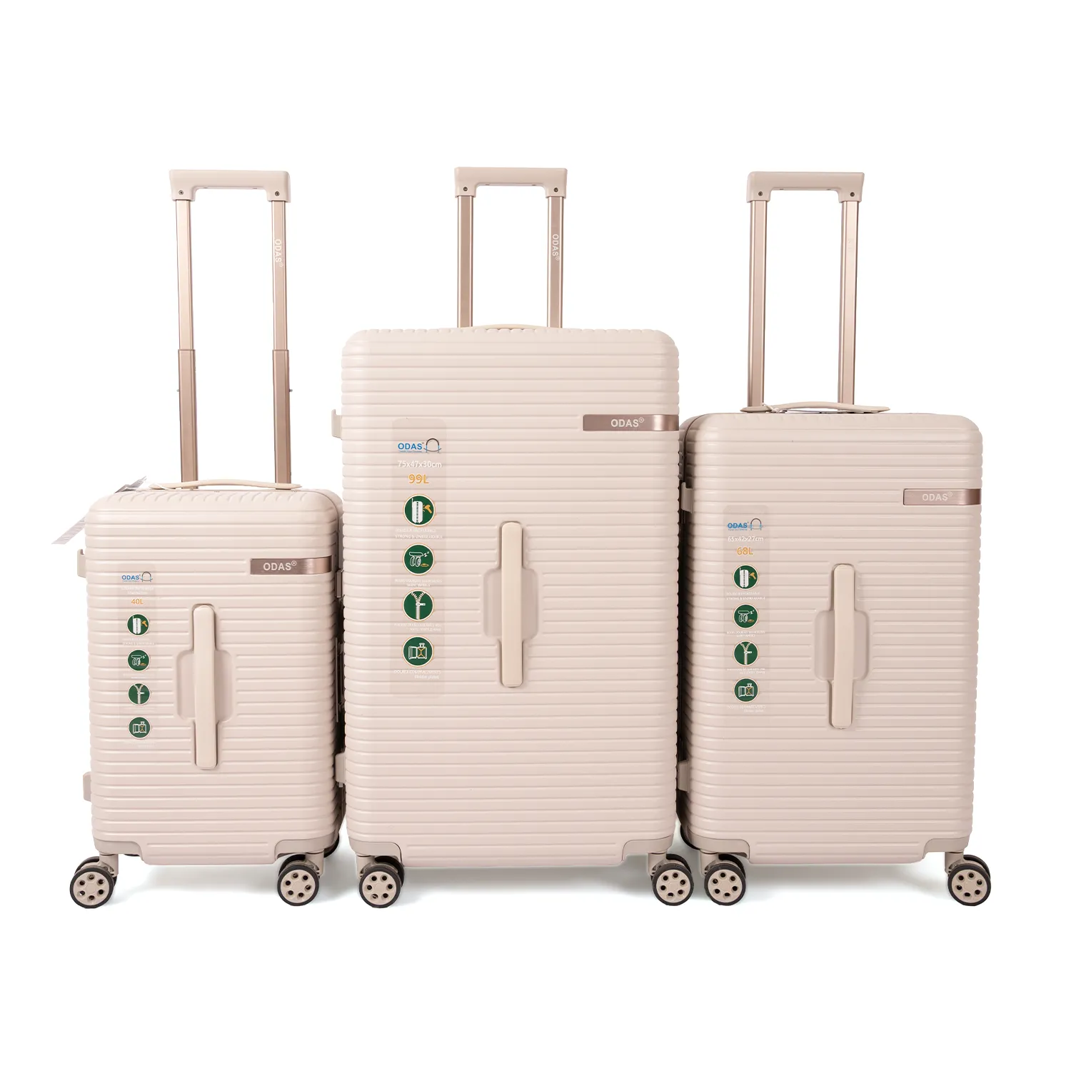 طقم شنط لون بيج ياتي باحجام مناسبة (28 إنش-24إنش-20إنش) يتميز بجوده عالية وتصميم جمع بين الاناقة والمتانة