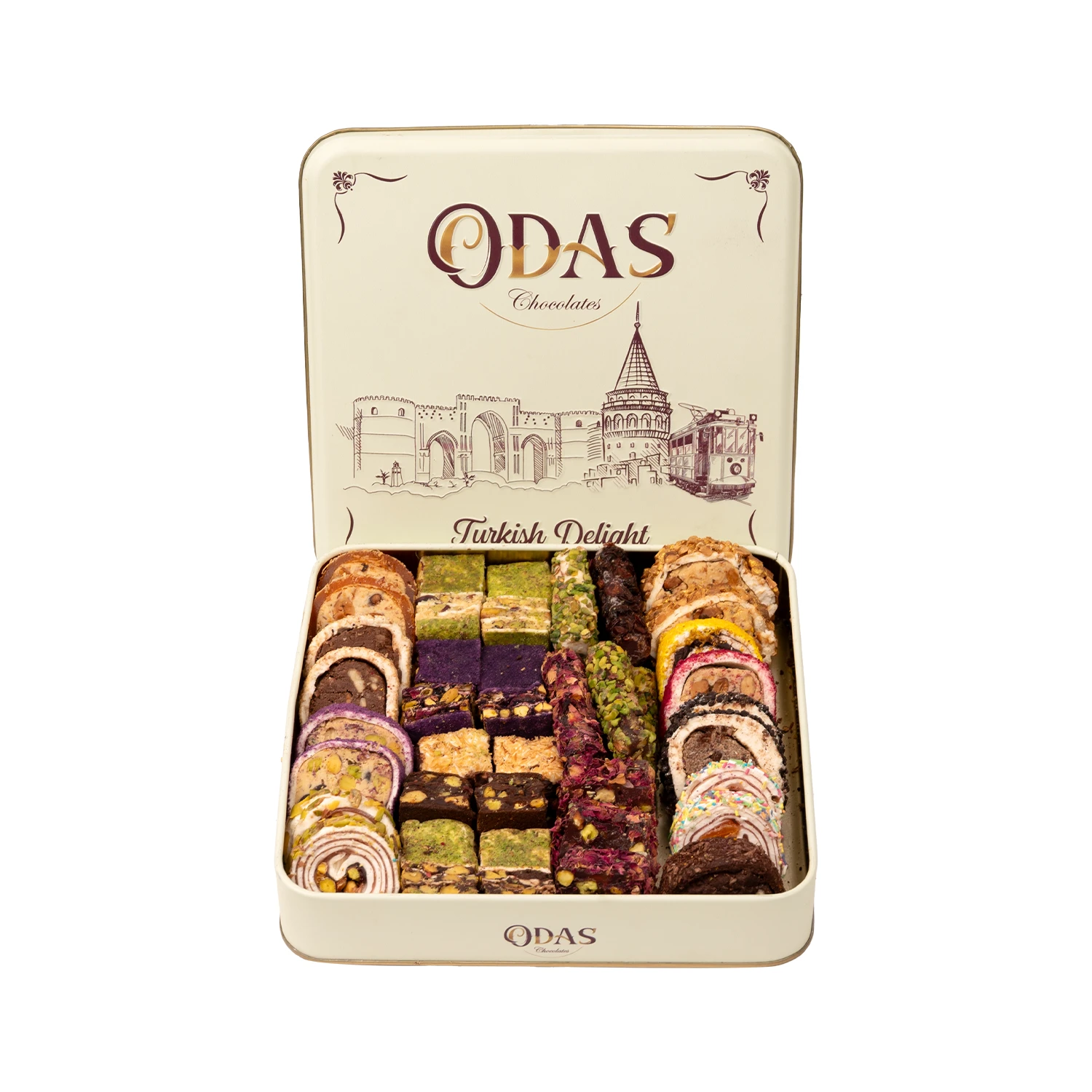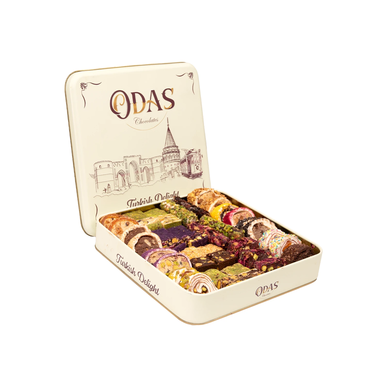 نقدم لكم هذه العلبة ذات التشكيلة الواسعة من الحلقوم بقطع دائرية ،مربعة واصابع مشكلة تأتي الحلوى داخل علبة معدنية أنيقة ، مما يجعلها خيارا مثاليا للإهداء في المناسبات أو لتقديمها لضيوفك بطريقة راقية.