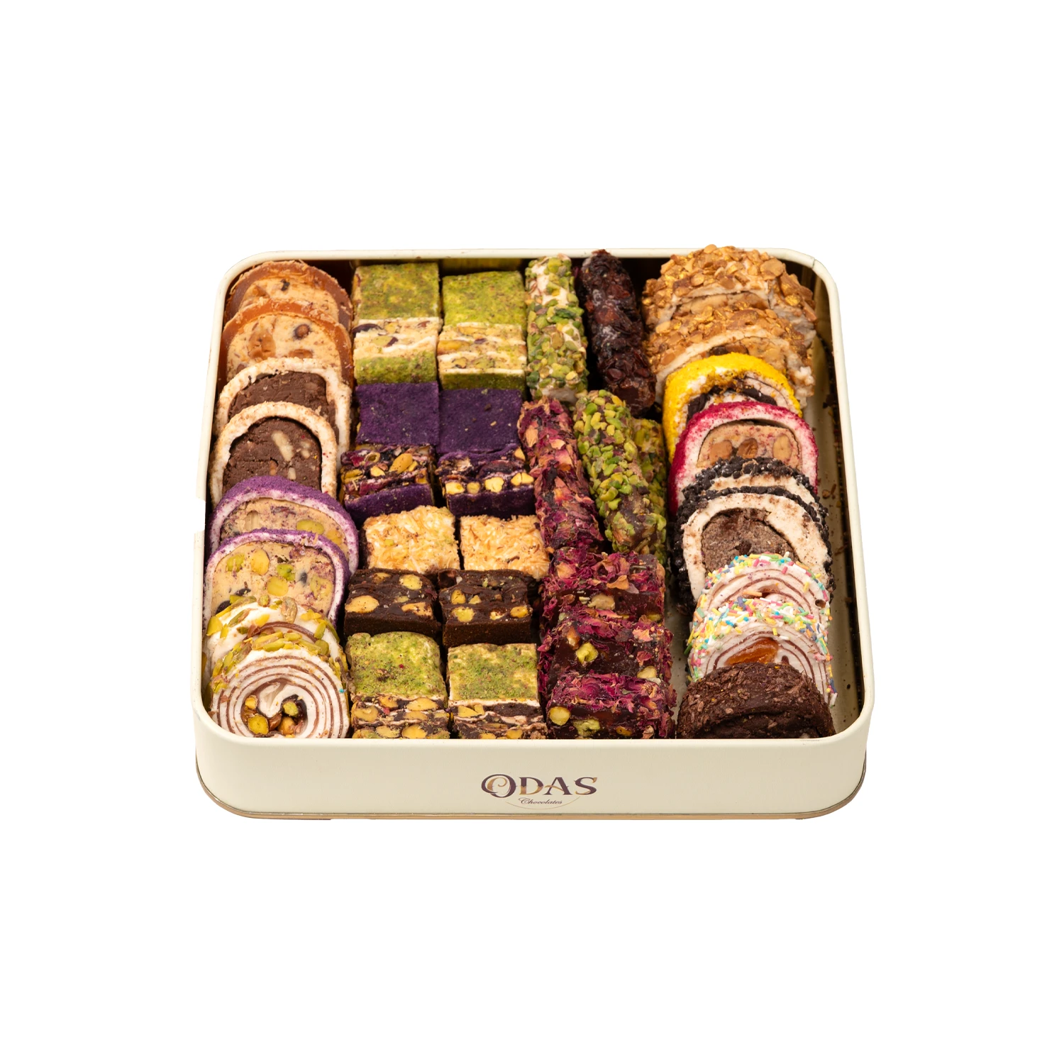 تضم هذه العلبة من الحلقوم المشكل بقطع مختلفة ومتعددة نكهات متنوعة مثل الفستق، الشوكولاتة، ، التوت الأحمر ، والموز ،نوجا ،شعيرية ، القهوة ،كنافة مع رشة بودرة الفستق ،كسر لوز ذهبي ، اوريو وغيرها من النكهات المختارة بعناية لتناسب جميع الأذواق.