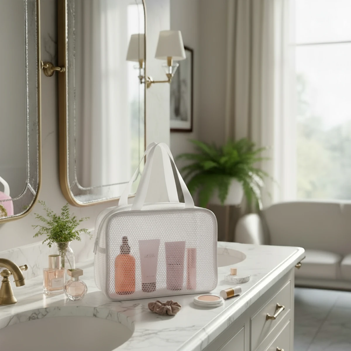 حقيبة مستلزمات التجميل لون رمادي مع واجهة شفافة