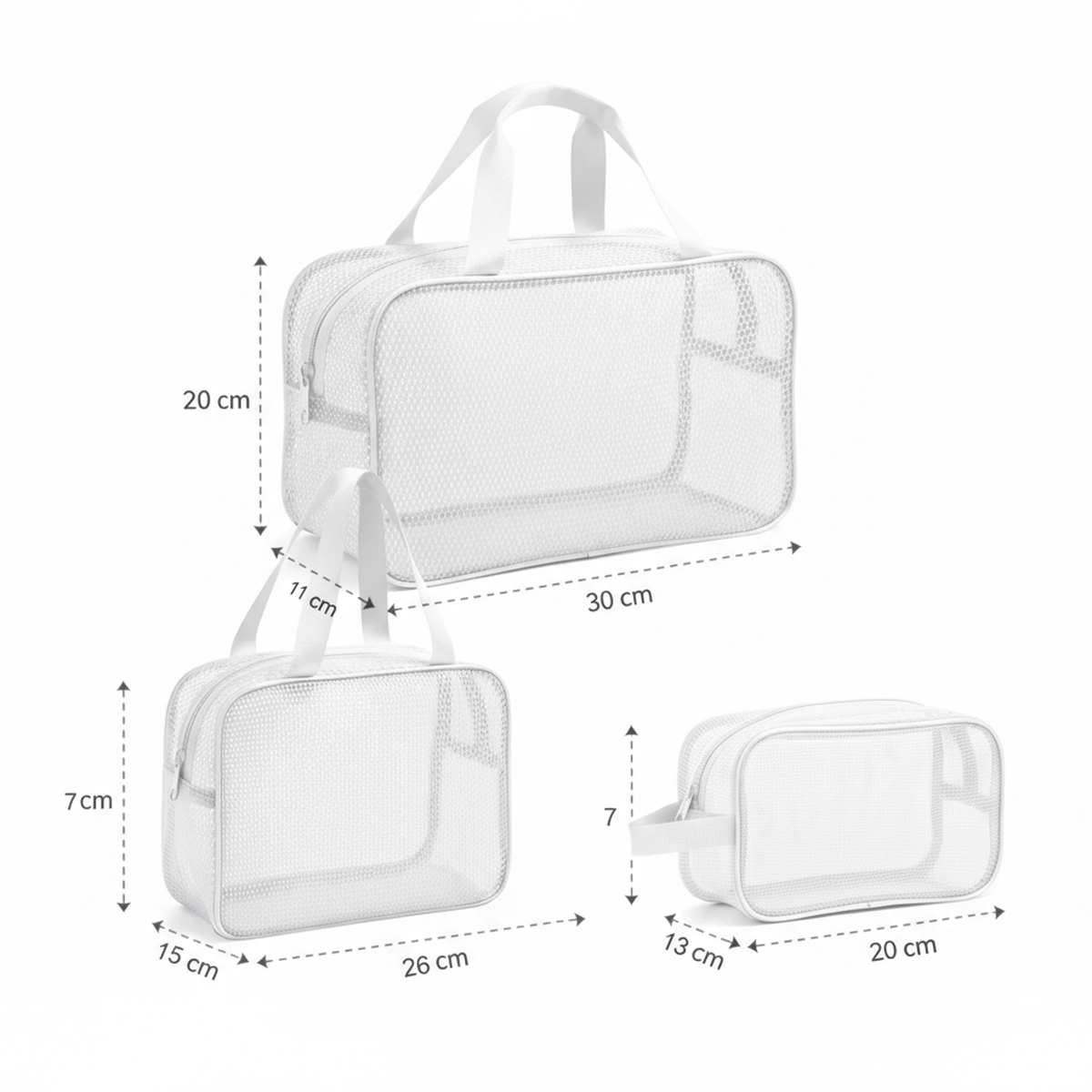 مجموعة حقائب شبكية مكونة من ثلاث قطع بأحجام مختلفة مناسبة لتخزين أدوات التجميل، الإكسسوارات، أو مستلزمات العناية الشخصية.